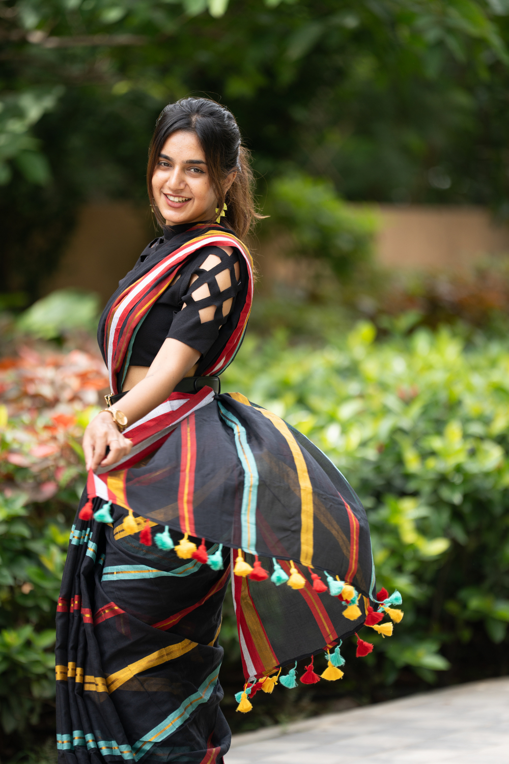 SAREEN Black Striped Mal Cotton Saree with Multicolor Border & Tassels
