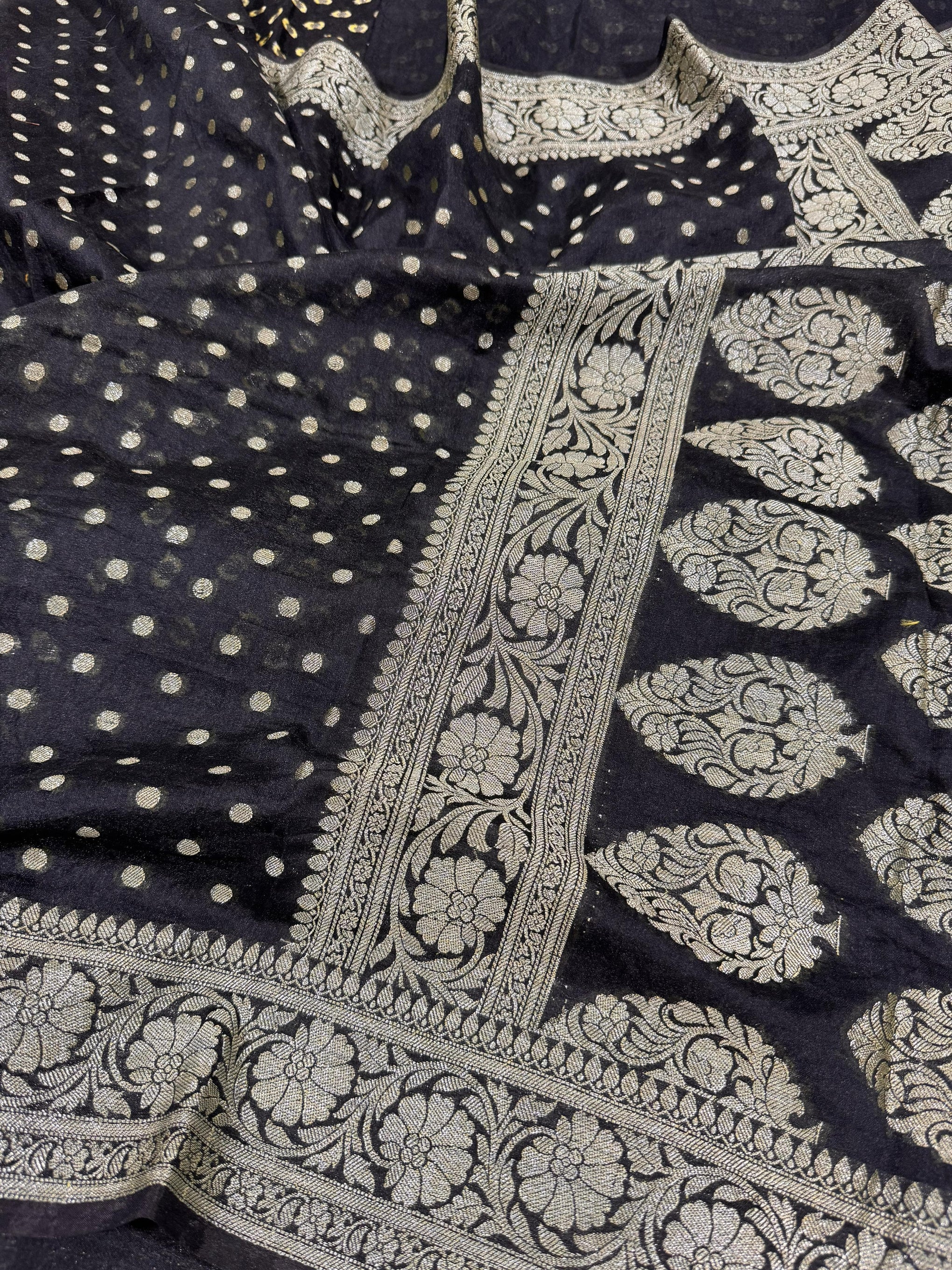 SAREEN Black Banarasi Silk Saree with Silver Zari Border