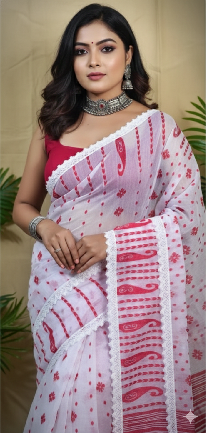 A timeless white and red Jamdani combination with intricate weaving and refined lace detailing — blending tradition with graceful sophistication.