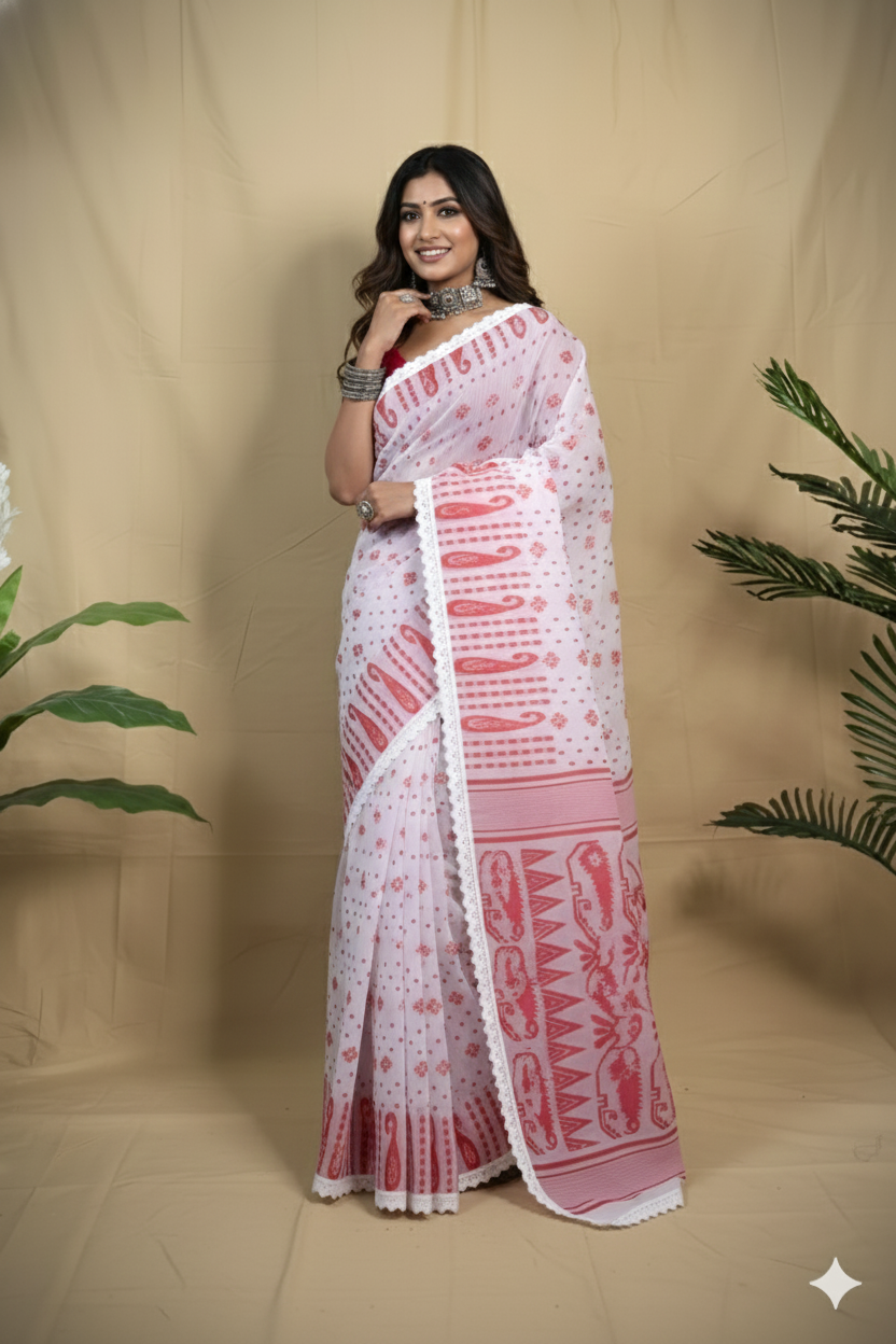 Gracefully woven in classic white and red, this Jamdani saree reflects timeless Bengali elegance. Featuring delicate motifs and a soft lace border, it is perfect for puja, festive celebrations, and cultural occasions.